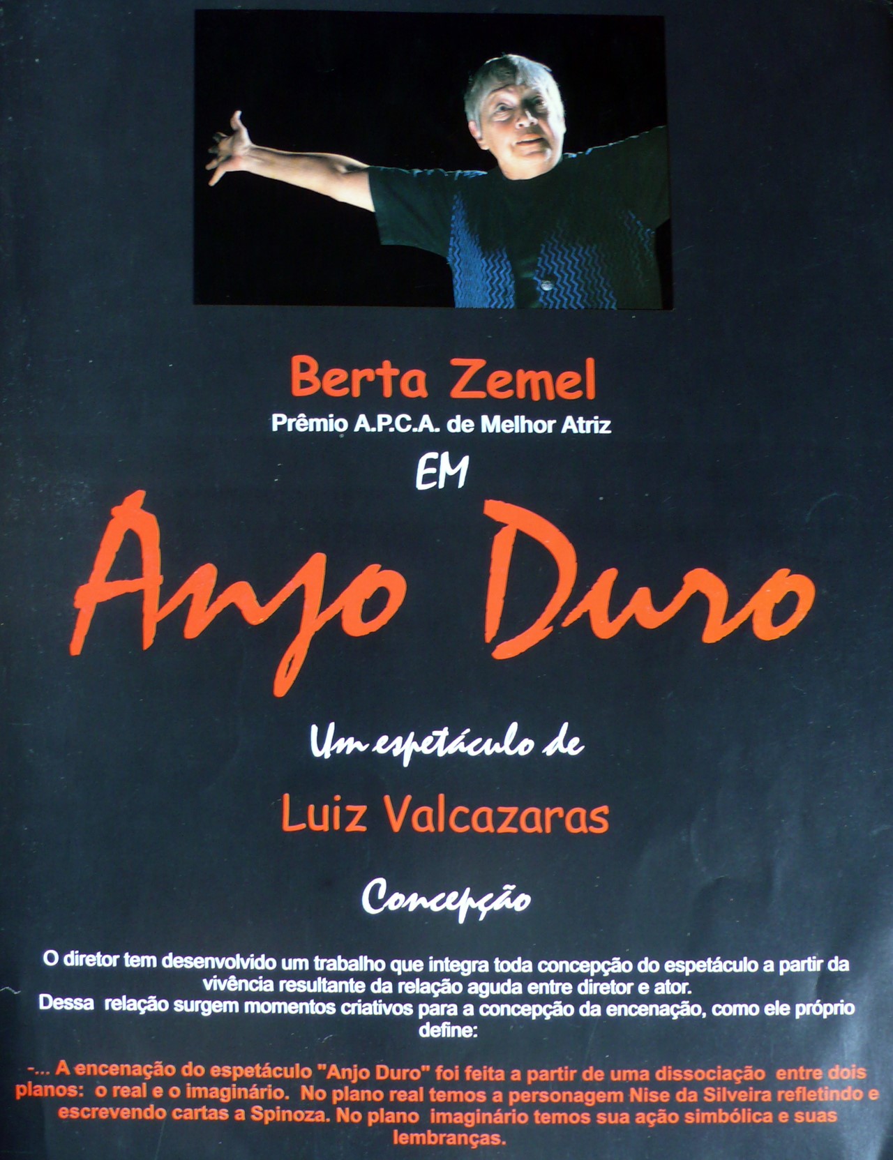 O espetáculo Anjo Duro – que rendeu a Berta Zemel o prêmio APCA de melhor atriz em 2000, e a indicação ao prêmio Shell como melhor atriz após 25 anos longe dos palcos -, volta agora em cartaz na Mostra de Inauguração do Teatro do Centro da Terra. Escrita e dirigida por Luiz Valcazaras, a peça conta a trajetória da psiquiatra Nise da Silveira, a mulher que revolucionou o tratamento psiquiátrico no Brasil ao abolir a prática comum dos eletrochoques, a acabou criando novos padrões para o entendimento do conceito de “loucura” através do uso da arte. Nise, interpretada por Berta Zemel, discute com o filósofo Spinoza, por correspondência, os subterrâneos da mente e a dificuldade do pensamento lógico em interagir com a abstração da insanidade humana.